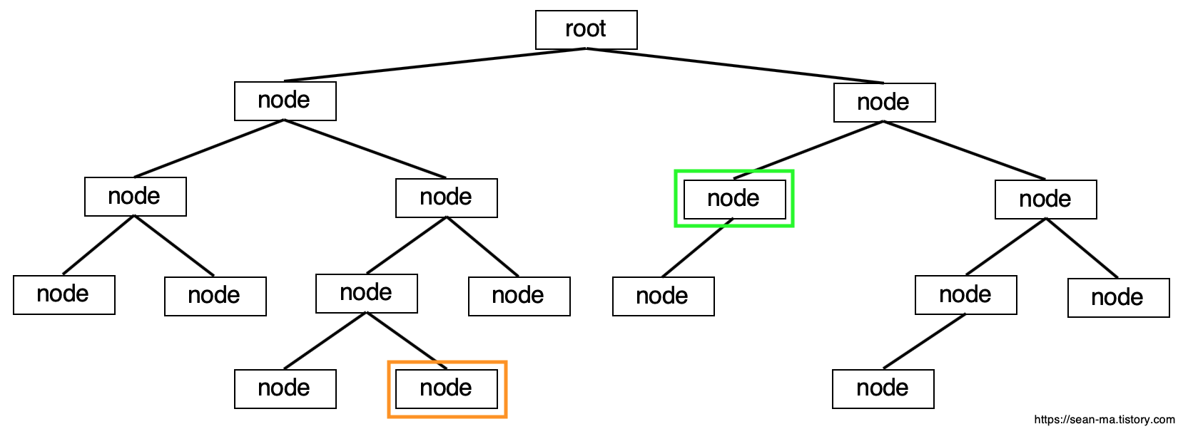 트리 자료구조에서 루트 노드의 깊이는 0이며 위 그림에서 초록색으로 하이라이트 된 노드의 깊이는 2, 주항색으로 하이라이트 된 노드의 깊이는 4입니다. 즉, 깊이란 루트 노드에서 몇 번의 재귀호출을 통하여 해당 노드에 접근이 가능한지를 나타낸 것이라 할 수 있겠습니다.