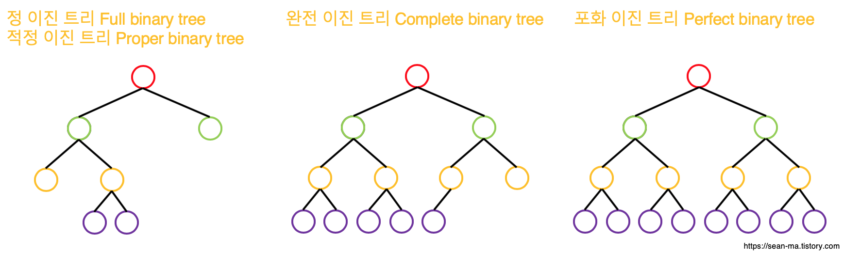 이진 트리는 자료의 삭입, 삭제 방법에 따라 정 이진 트리 Full binary tree(혹은 적정 이진 트리 Proper binary tree), 완전 이진 트리 Complete binary tree, 포화 이진 트리 Perfect binary tree 로 나뉩니다.