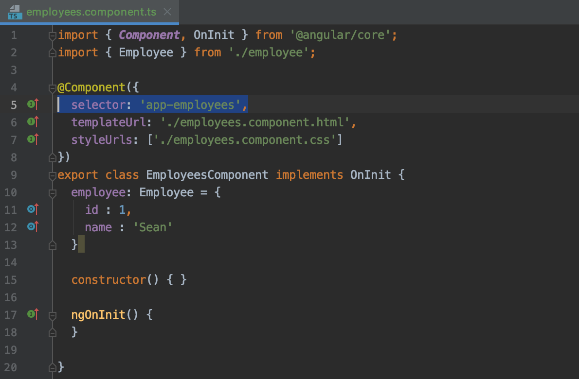 작성한 클래스를 employees.component.ts 내에서 import한 후, employee 하나를 임의로 생성해 줍니다.
