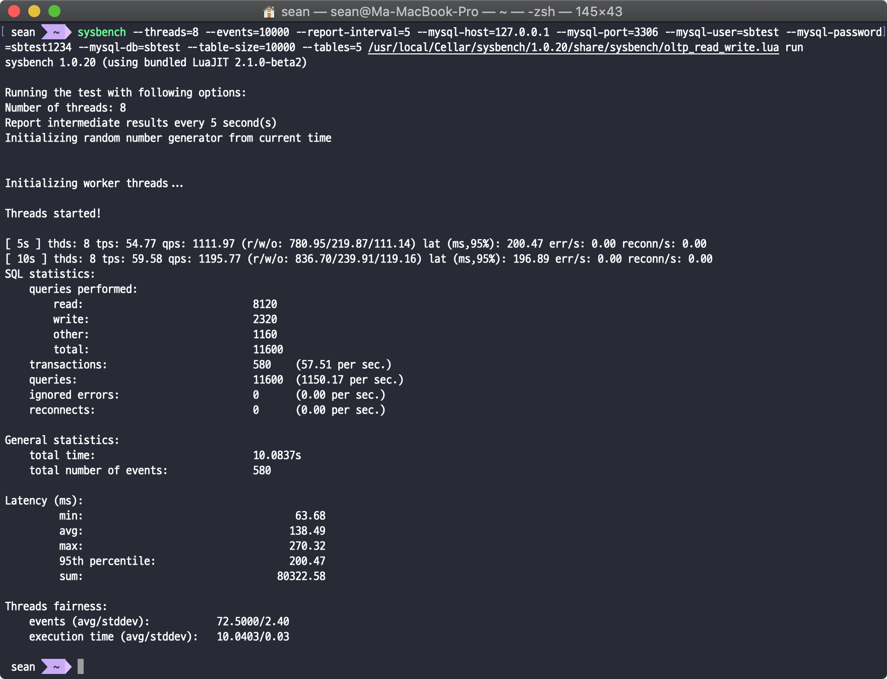 sysbench --threads=8 --events=10000 --report-interval=5 --mysql-host=127.0.0.1 --mysql-port=3306 --mysql-user=sbtest --mysql-password=sbtest1234 --mysql-db=sbtest --table-size=10000 --tables=5 /usr/local/Cellar/sysbench/1.0.20/share/sysbench/oltp_read_write.lua run |