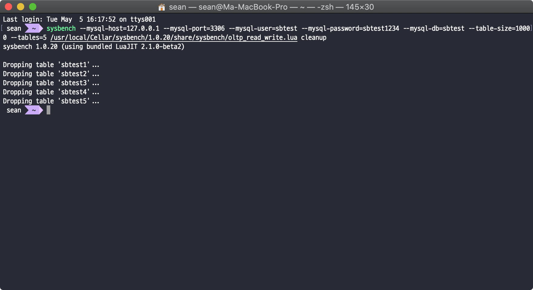 sysbench --mysql-host=127.0.0.1 --mysql-port=3306 --mysql-user=sbtest --mysql-password=sbtest1234 --mysql-db=sbtest --table-size=10000 --tables=5 /usr/local/Cellar/sysbench/1.0.20/share/sysbench/oltp_read_write.lua cleanup |