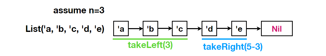 이전 문제와 비슷하게 take와 takeRight 함수로 리스트를 분리한 다음 튜플로 조합하여 반환하는 방법으로 해결합니다. 첫 부분의 길이 n이 리스트 전체의 길이보다 크다면 IndexOutOfBoundsException을 던져줍니다.