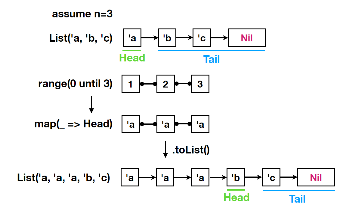 주어진 숫자를 n이라고 할 때, 0..n의 range 컬렉션을 생성한 다음 각 컬렉션의 원소를 map 함수를 사용하여 복제할 원소(head)로 매핑해 준다음 리스트로 변환하여 tail을 append 해 줍니다.